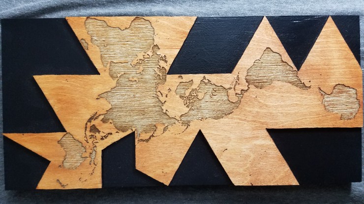 The AuthaGraph Created by Hajime Narukawa. This is mahogany on pine with no top coat, this one is 15″ X 7″